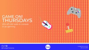 First time PC gamers get their first 3 hours for free when setting up a new PC gaming account at HUB Games’ Esports Arena & Gaming Lounge. UW Students/Staff only.